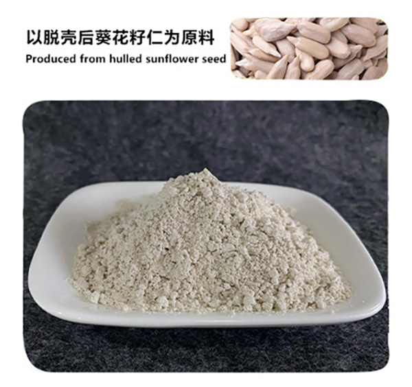 經(jīng)脫脂后, 對(duì)葵花仁餅進(jìn)行滅菌和磨粉加工后獲得的蛋白粉。